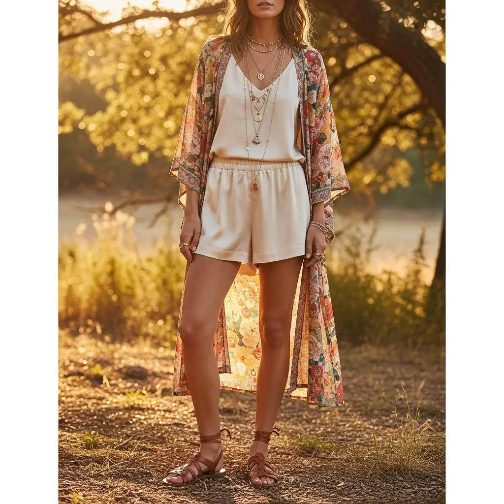 - Terracotta silk shorts + printed kimono in earth tones = desert festival ready