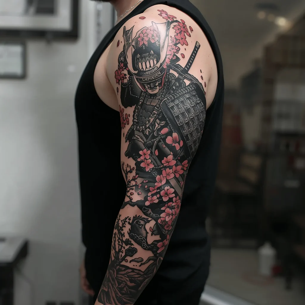 The warrior-poet aesthetic of samurai tattoos combined with delicate cherry blossoms creates this beautiful juxtaposition of strength and fragility. Ever wondered why this combo works so well? It represents the samurai’s understanding that life is both beautiful and fleeting.