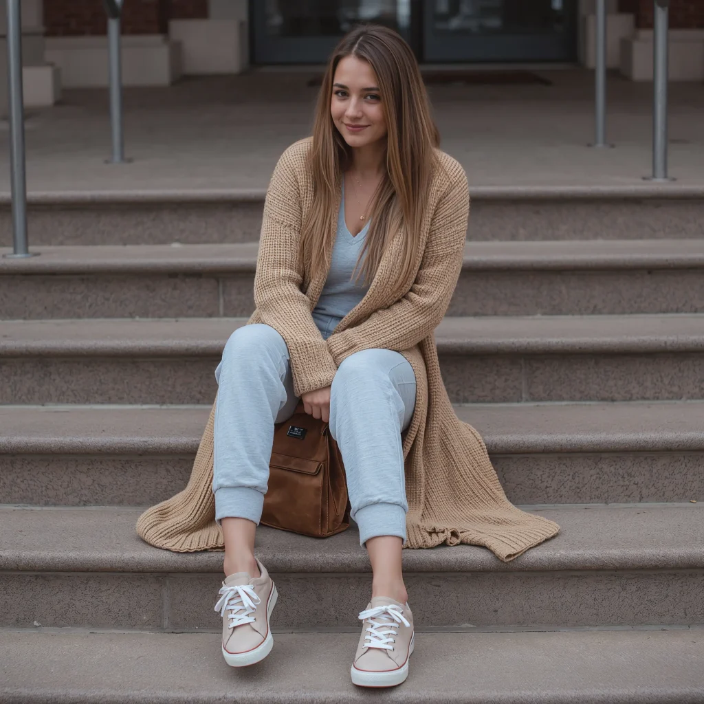 This outfit walks the line between dressy and casual perfectly. You look put-together enough for presentations but comfortable enough for those marathon library sessions. Neutral colors work best here – think cream, beige, gray, or soft pastels that complement rather than compete.