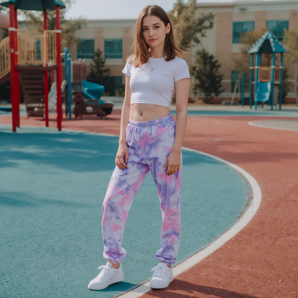 The rule here? Keep everything else simple. A plain white, black, or matching solid color top lets the tie-dye sweatpants shine without creating visual chaos. Fitted tops work best to balance the usually relaxed fit of tie-dye sweats.
