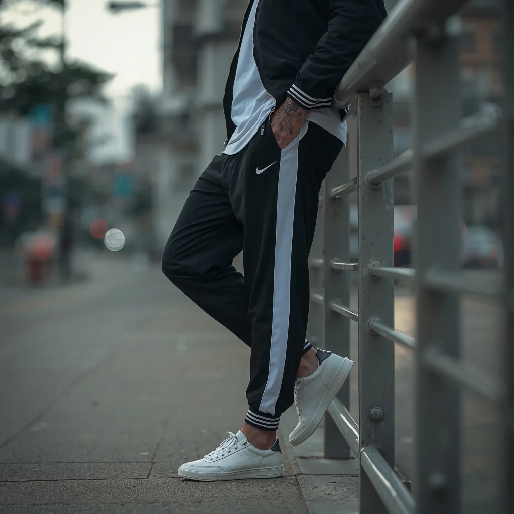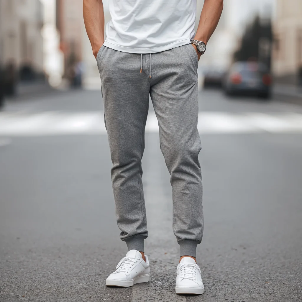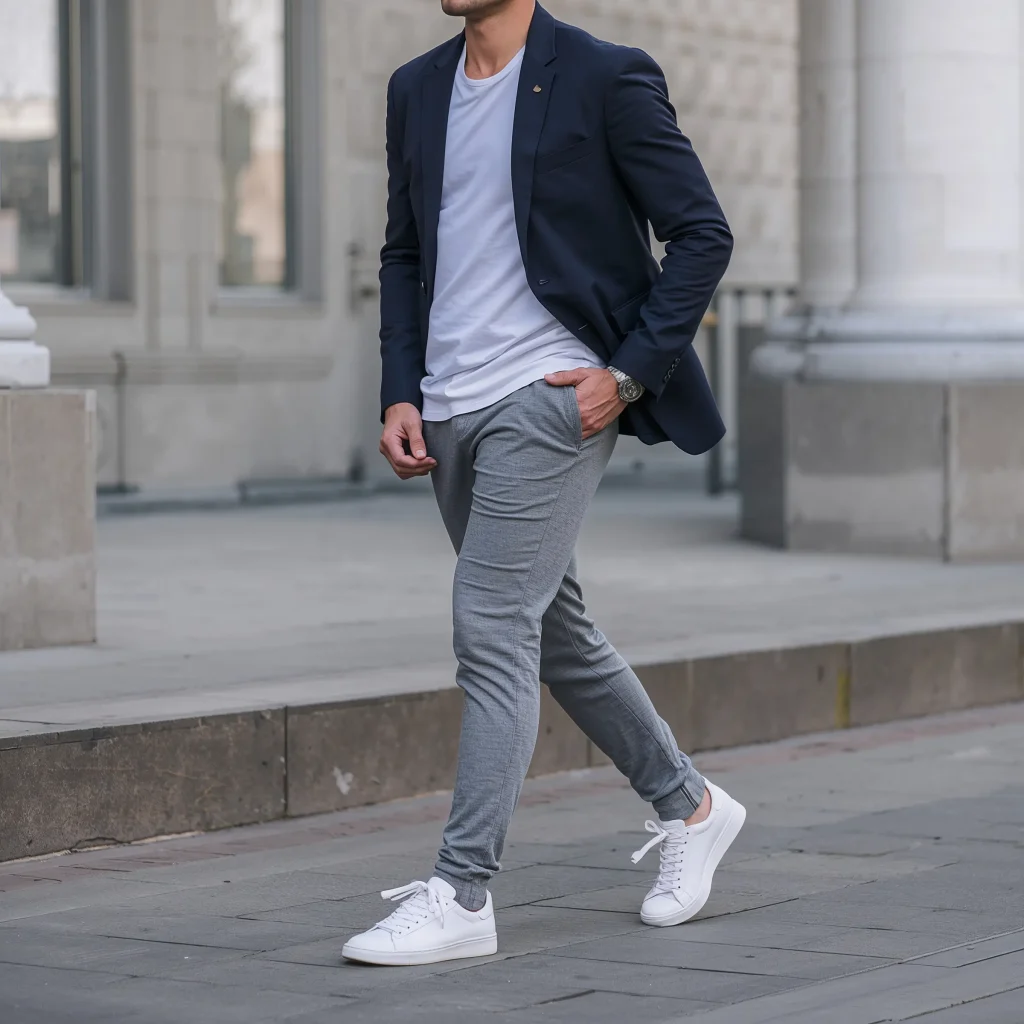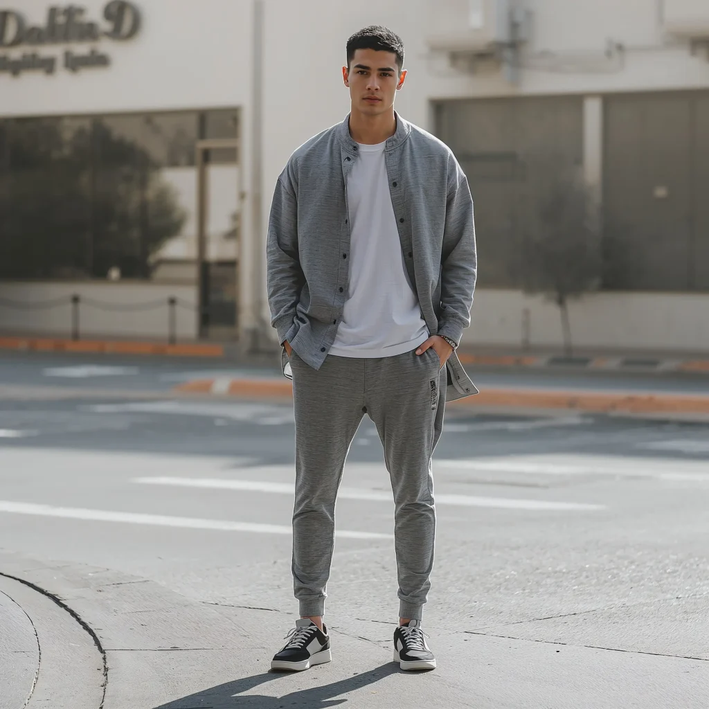 This combo right here? It’s the bread and butter of casual menswear. Grey sweatpants paired with crisp white sneakers creates that effortlessly cool vibe that works literally everywhere. I rock this look at least twice a week because it just works.