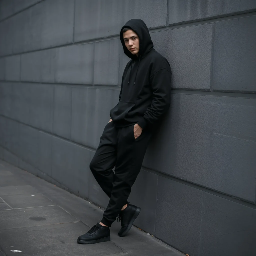 Color coordination matters here too. You can stick with black-on-black for that ninja vibe, or throw in a pop of color with the hoodie. Personally, I love a cream or sage green hoodie with black joggers – it’s unexpected but works every time.