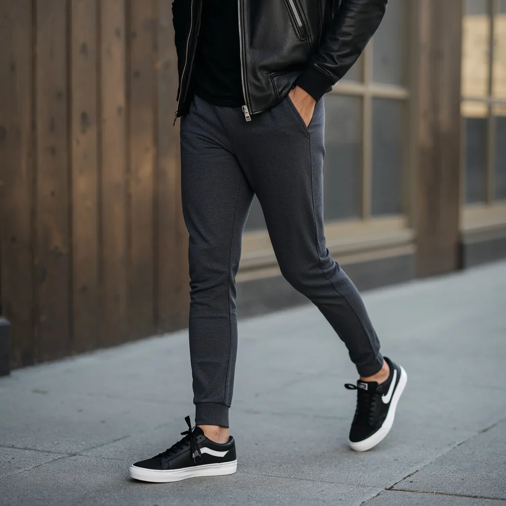 The fit is crucial here – baggy sweatpants will make you look sloppy next to the structured leather. Go for sweatpants that hug your legs without being skin-tight. The leather jacket adds instant edge and sophistication to what’s essentially athletic wear.