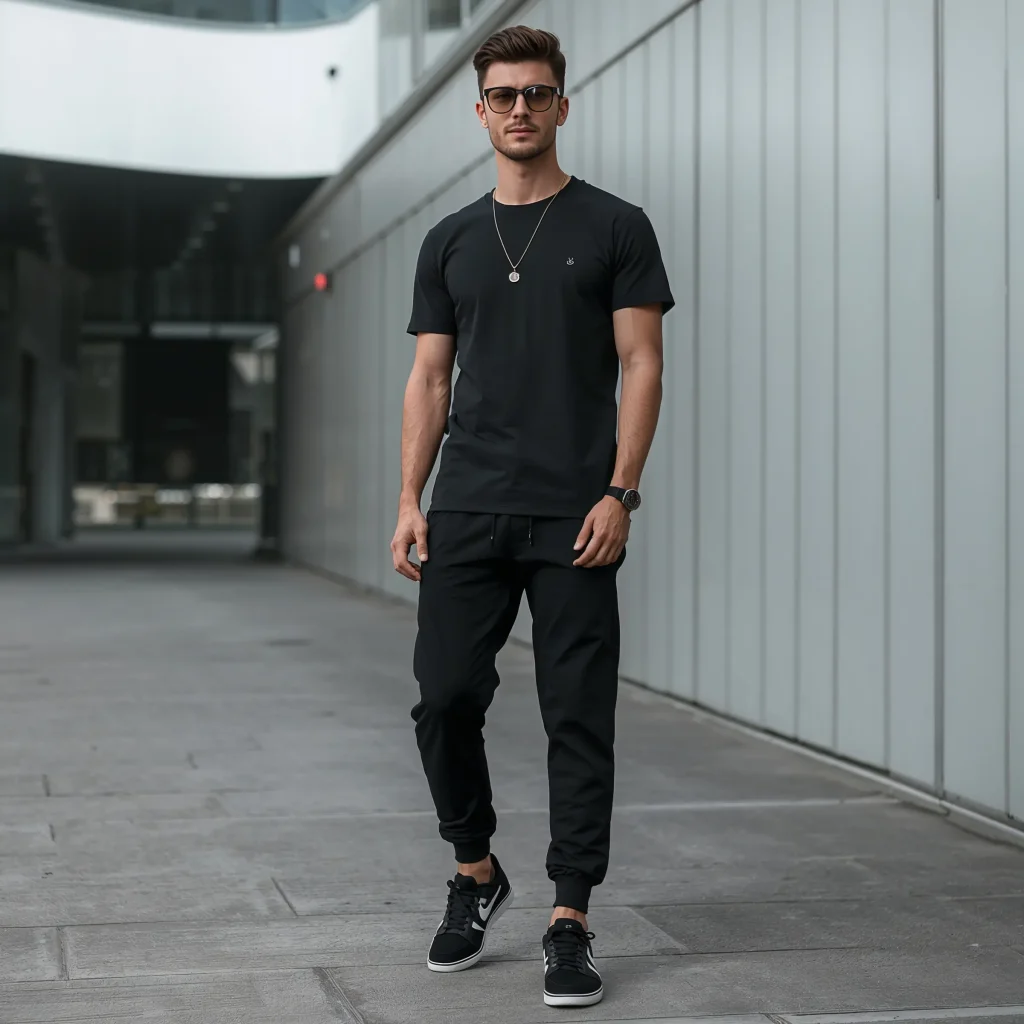 All-black is the obvious choice – it’s slimming, always looks intentional, and works in any setting. But don’t sleep on all-grey or all-navy either. The key is varying the shades slightly to create depth. Maybe your sweatpants are charcoal while your tee is heather grey.