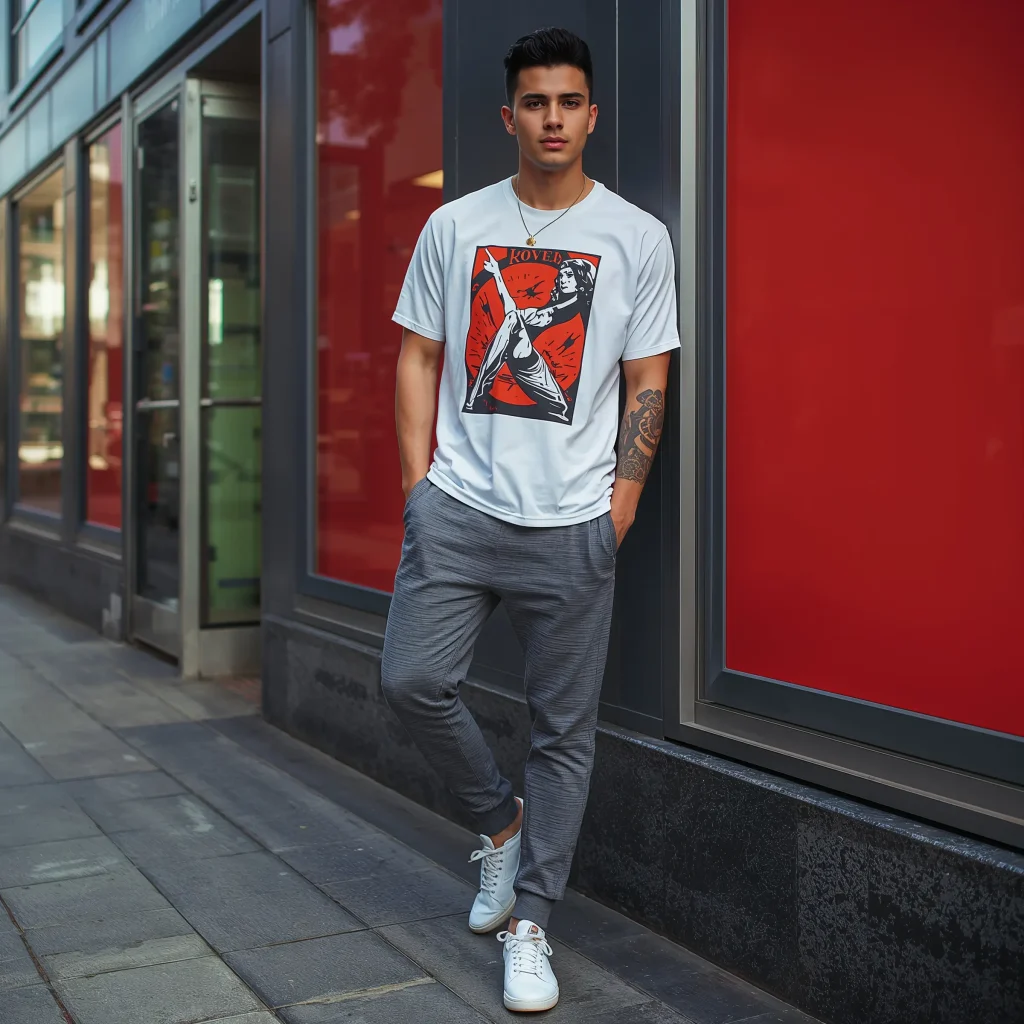 This is the weekend warrior uniform, and there’s absolutely nothing wrong with that. A graphic tee adds personality while sweatpants and sneakers keep you comfortable for whatever the day throws at you. It’s the outfit equivalent of not trying too hard, which paradoxically makes you look cooler.