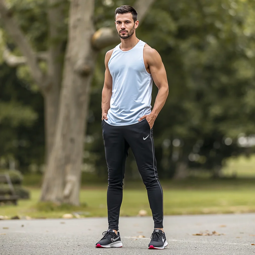 The tank should be fitted but not skin-tight. Muscle tanks or basketball-style tanks work best with sweatpants. Colors matter here – grey sweatpants with a black tank is classic, but don’t sleep on earth tones like olive or burgundy.