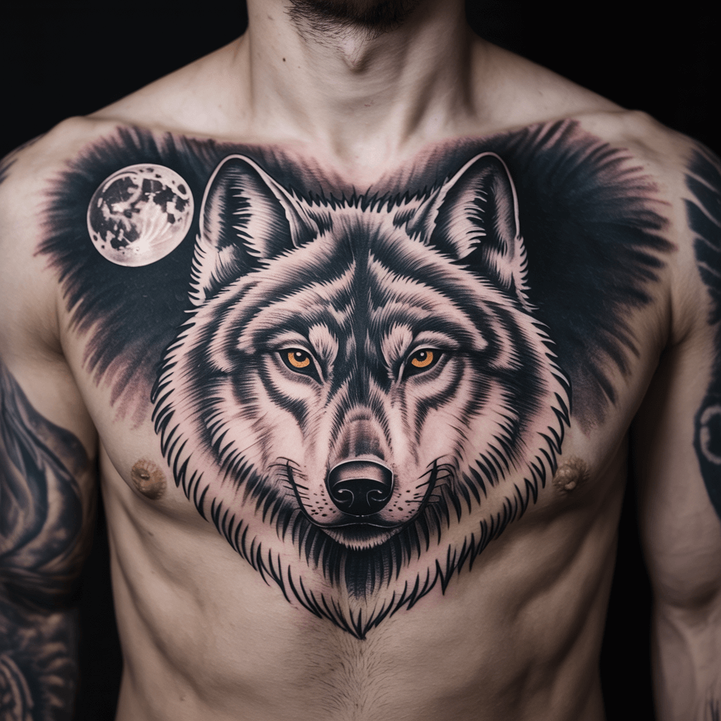 Wolves represent loyalty, family, and wild freedom. Adding the moon brings in mystery, cycles, and that primal connection to nature. When you spread this across chest and neck, you create this epic scene that tells your story without words.