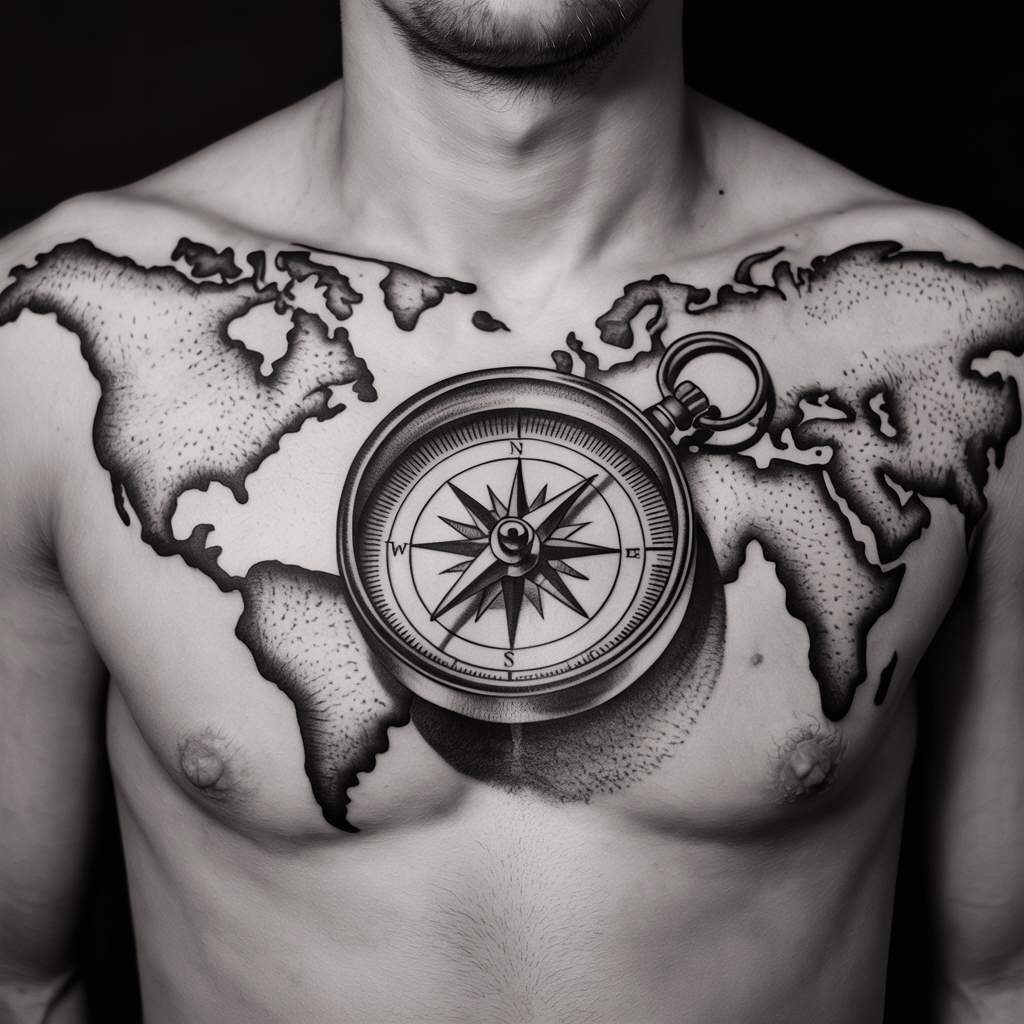 Picture a detailed compass rose on your chest with latitude lines extending to your neck, maybe incorporating meaningful coordinates or constellation patterns. Some guys add mountain ranges, ocean waves, or city skylines to personalize their journey.