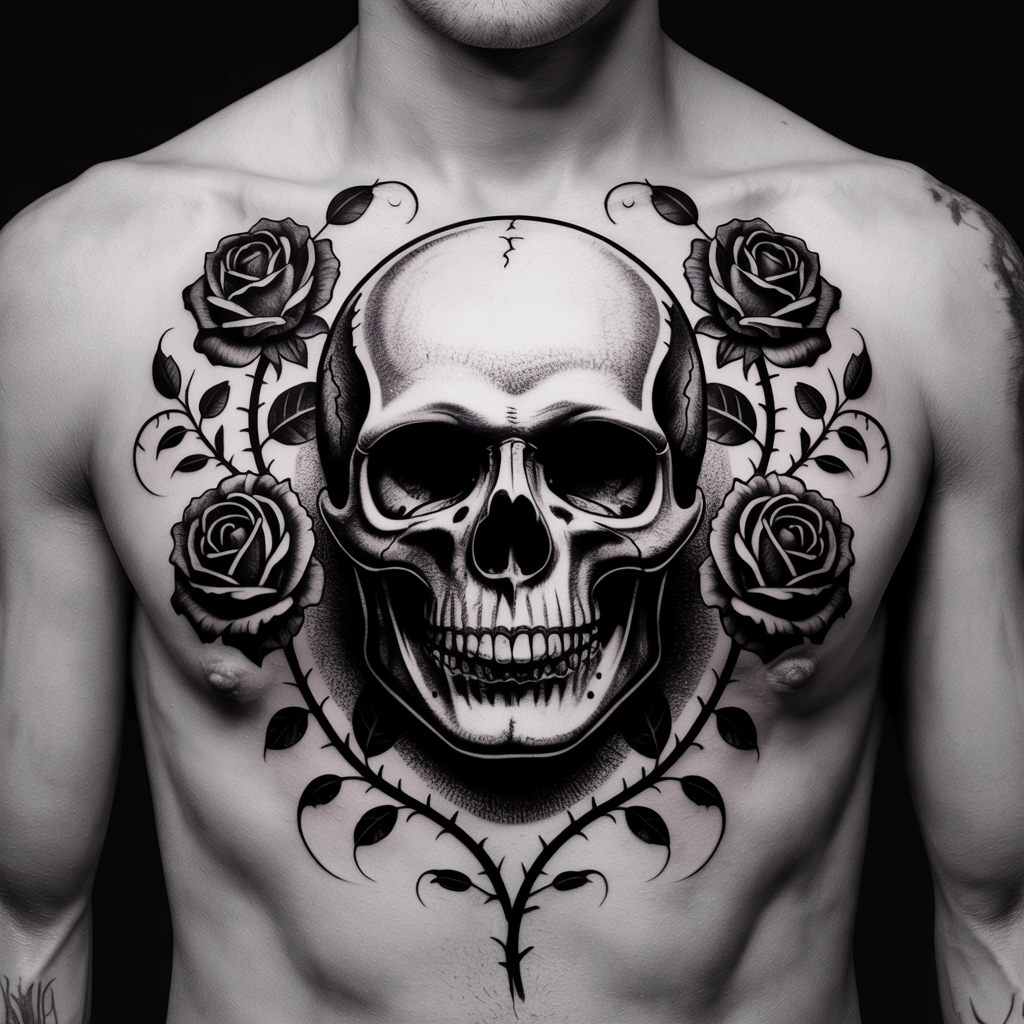 The contrast between death (skull) and beauty (roses) creates powerful visual tension. Spreading this from chest to neck allows for narrative development – maybe the roses grow wilder as they climb toward your throat, or the skull transitions into something else entirely.
