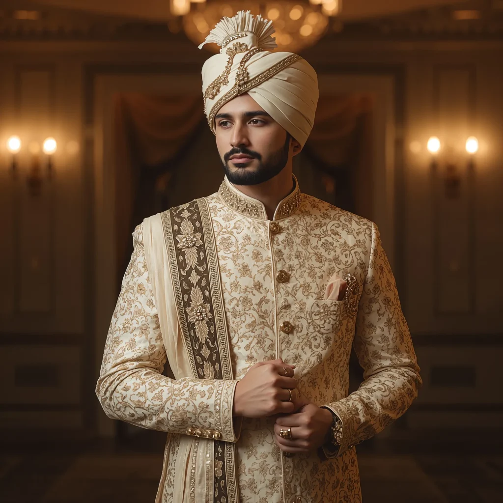 FYI, fit is everything when it comes to sherwanis. Get it tailored properly because nothing ruins a royal look faster than a poorly fitted outfit. The shoulders should sit perfectly, and the length should hit just right β typically mid-thigh for most body types.